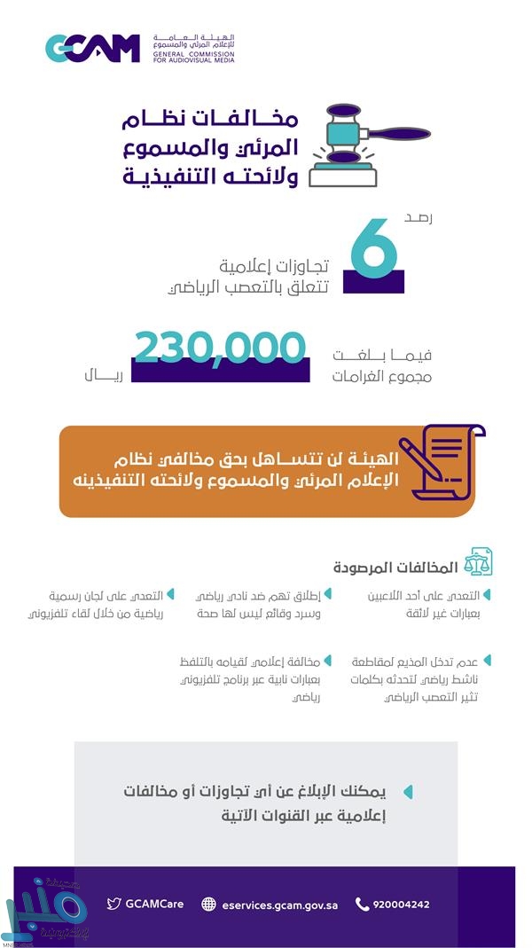 آخر الأخبار > تضمنت نشر تجاوزات تؤجج التعصب الرياضي.. 230 ألف ريال غرامات بحق 6 مخالفين