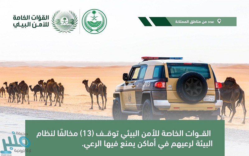 أوقفت القوات الخاصة للأمن البيئي (13) مخالفًا لنظام البيئة، (4) مواطنين و(9) مقيمين من الجنسيتين السودانية والهندية، ارتكبوا مخالفات رعي (317) رأسًا من الإبل و(85) رأسًا من الأغنام في أماكن يمنع فيها الرعي في عدد من مناطق المملكة.