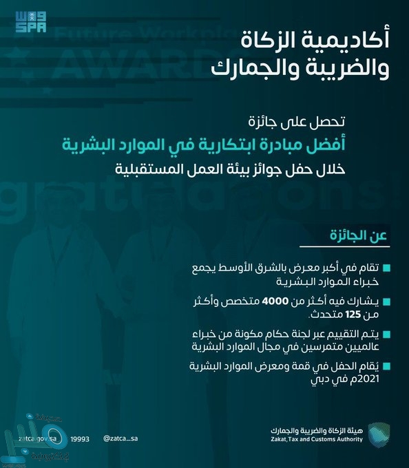 حصلت هيئة الزكاة والضريبة والجمارك للمرة الثانية على التوالي على جائزة “أفضل مبادرة ابتكارية في الموارد البشرية”، خلال مشاركتها في حفل جوائز بيئة العمل المستقبلية في دبي، وذلك على إثر النجاح الذي حققته مبادرة “أكاديمية الزكاة والضريبة والجمارك” خلال عامين فقط من إطلاقها.