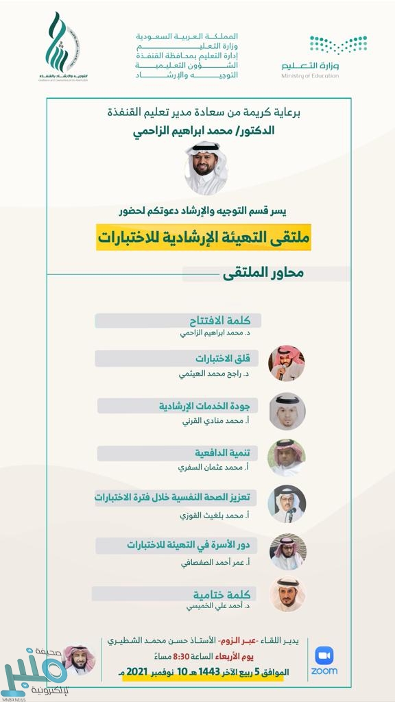 يرعى مدير التعليم في محافظة القنفذة الدكتور محمد بن إبراهيم الزاحمي يوم غدٍ الأربعاء، في تمام الساعة 8:30 مساءً، ملتقى التهيئة الإرشادية للاختبارا، بتنظيم قسم التوجيه الطلابي، وبإشراف مباشر من مدير القسم الدكتور أحمد علي الخميسي، وبمشاركة نخبة مميزة من المختصين في مجال التوجيه الطلابي.