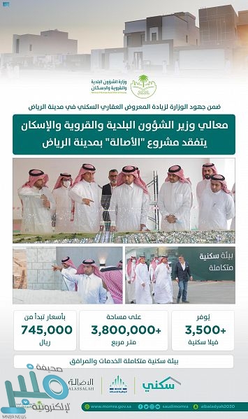 تفقد معالي وزير الشؤون البلدية والقروية والإسكان الأستاذ ماجد بن عبدالله الحقيل اليوم، أعمال التطوير والبنية التحتية في مشروع “الأصالة” الواقع جنوب غرب مدينة الرياض، والذي تطوره الشركة الوطنية للإسكان (NHC) لمستفيدي برنامج سكني، لزيادة نسبة تملك الأسر السعودية للمساكن إلى 70% بحلول 2030، تحقيقاً لمستهدفات برنامج الإسكان – أحد برامج رؤية المملكة 2030-.