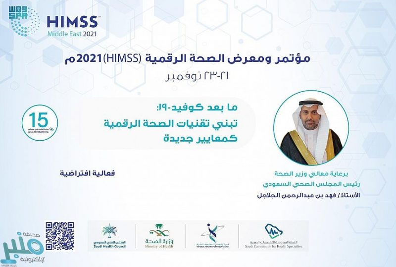 تحت رعاية معالي وزير الصحة رئيس المجلس الصحي السعودي الأستاذ فهد بن عبدالرحمن الجلاجل؛ تعقد خلال الفترة 21 – 23 نوفمبر 2021م فعاليات مؤتمر ومعرض الصحة الرقمية الدولي 2021 (HIMSS) في نسخته الثالثة تحت شعار” ما بعد كوفيد-19: تبنّي تقنيات الصحة الرقمية كمعايير جديدة” بتنظيم من المجلس الصحي ممثلاً بالمركز الوطني للمعلومات الصحية بالتعاون مع منظمة جمعية أنظمة المعلومات والإدارة للرعاية الصحية الأمريكية (HIMSS) ، والشراكة مع وزارة الصحة والهيئة السعودية للتخصصات الصحية.