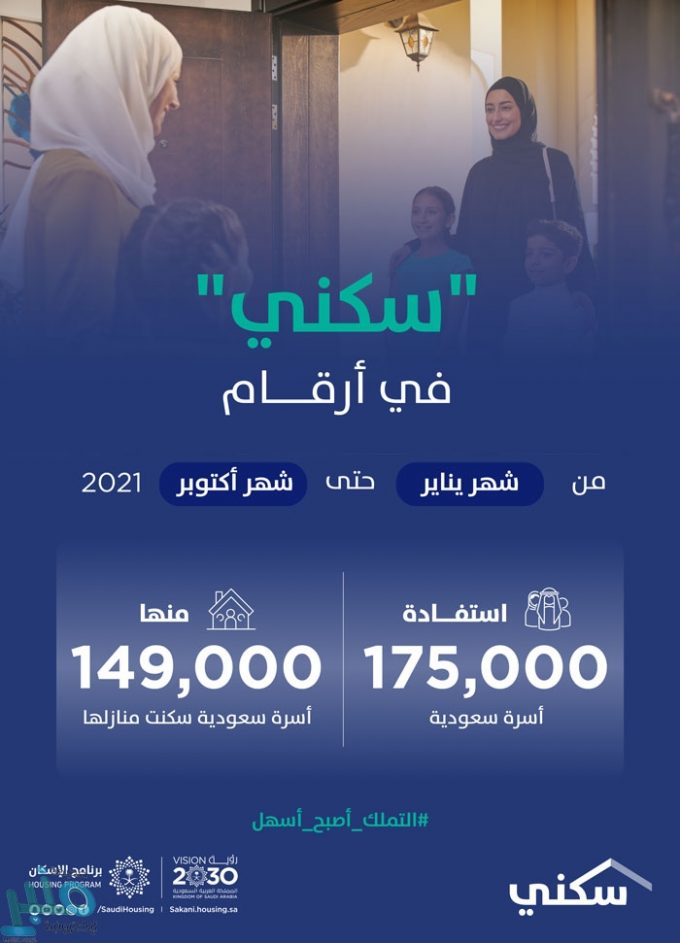أعلن برنامج “سكني” عن استفادة 175,520 أسرة من الخيارات والحلول السكنية المتنوعة، منذ بداية العام الجاري 2021 حتى نهاية شهر أكتوبر، فيما بلغت أعداد الأسر التي سكنت منازلها 149,619 أسرة، وذلك استمراراً لجهود “سكني” لتحقيق مستهدفات برنامج الإسكان – أحد برامج رؤية المملكة 2030- بتمكين الأسر السعودية من تملّك المسكن الأول للوصول إلى نسبة تملّك 70% بحلول العام 2030.