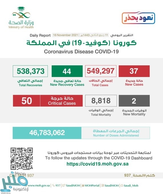 وأضافت الصحة أن إجمالي حالات المصابين في المملكة وصل إلى 549297 حالة حتى الآن، ووصل مجموع المتعافين إلى 538373 حالة، فيما بلغ إجمالي الوفيات 8818 حالة وفاة.