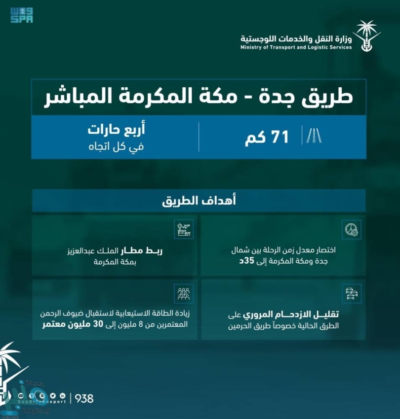 تواصل وزارة النقل والخدمات اللوجستية تنفيذ أعمال مشروع الطريق الرابط بين جدة ومكة المكرمة المباشر، الذي يبلغ طوله 71 كم، ويتضمن أربع حارات في كل اتجاه، وذلك ضمن جهودها في تحسين جودة الطرق، والارتقاء بكافة الخدمات المقدمة.