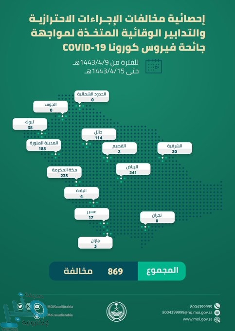 بلغت إحصائية مخالفات الإجراءات الاحترازية والتدابير الوقائية من فيروس كورونا “كوفيد-19” (869) مخالفات، وذلك للفترة من 9 / 4 / 1443هـ حتى 15 / 4 / 1443هـ .