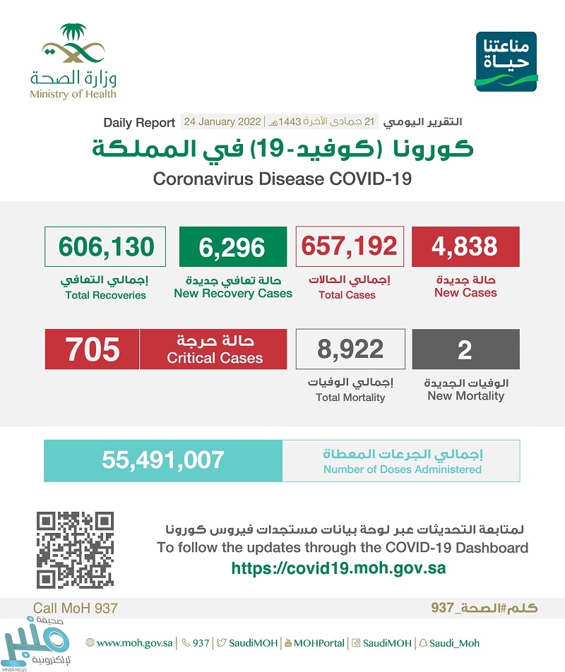 وأضافت الصحة أن إجمالي حالات المصابين في المملكة وصل إلى 657192 حالة حتى الآن، ووصل مجموع المتعافين إلى 606130 حالة، فيما بلغ إجمالي الوفيات 8922 حالة وفاة.