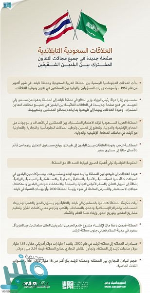 وستسهم زيارة دولة رئيس الوزراء وزير الدفاع في مملكة تايلند الجنرال برايوت تشان أوتشا إلى المملكة بدعوة كريمة من صاحب السمو الملكي الأمير محمد بن سلمان بن عبدالعزيز ولي العهد نائب رئيس مجلس الوزراء وزير الدفاع – حفظه الله – في فتح صفحة جديدة في العلاقات الثنائية بين البلدين في جميع مجالات التعاون المشترك، وعودة العلاقات بينهما إلى طبيعتها بما يخدم مصالح المملكتين وشعبيهما.