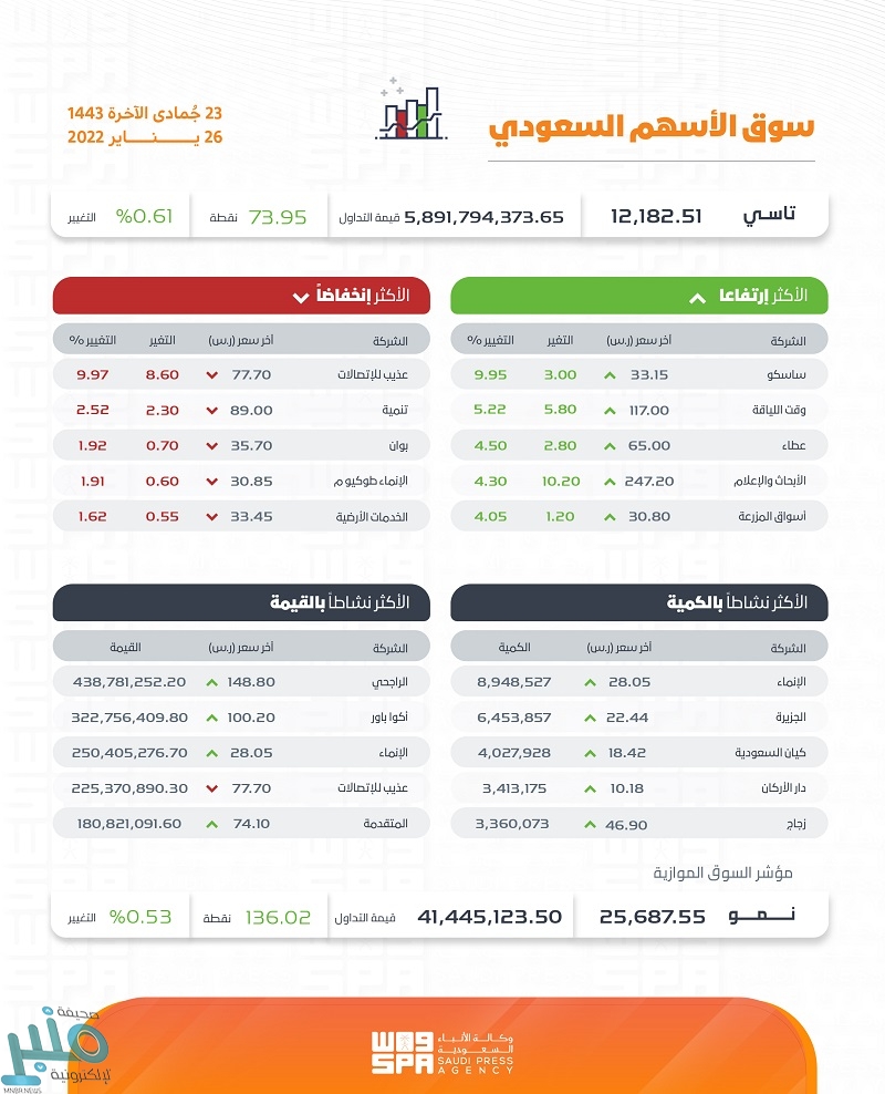 وبلغت كمية الأسهم المتداولة -وفق النشرة الاقتصادية اليومية لوكالة الأنباء السعودية لسوق الأسهم السعودية- 134 مليون سهم، تقاسمتها أكثر من 260 ألف صفقة، سجلت فيها أسهم 122 شركة ارتفاعًا في قيمتها, فيما أغلقت أسهم 67 شركة على تراجع.