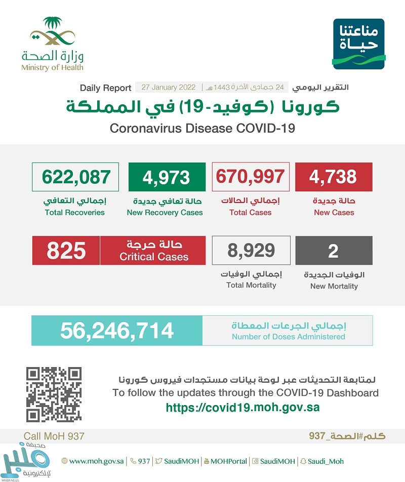 أعلنت وزارة الصحة، اليوم الخميس عن تسجيل 4738 إصابة جديدة بفيروس كورونا، و 4973 حالة تعافي و حالتي وفاة ، و 825 حالة حرجة.