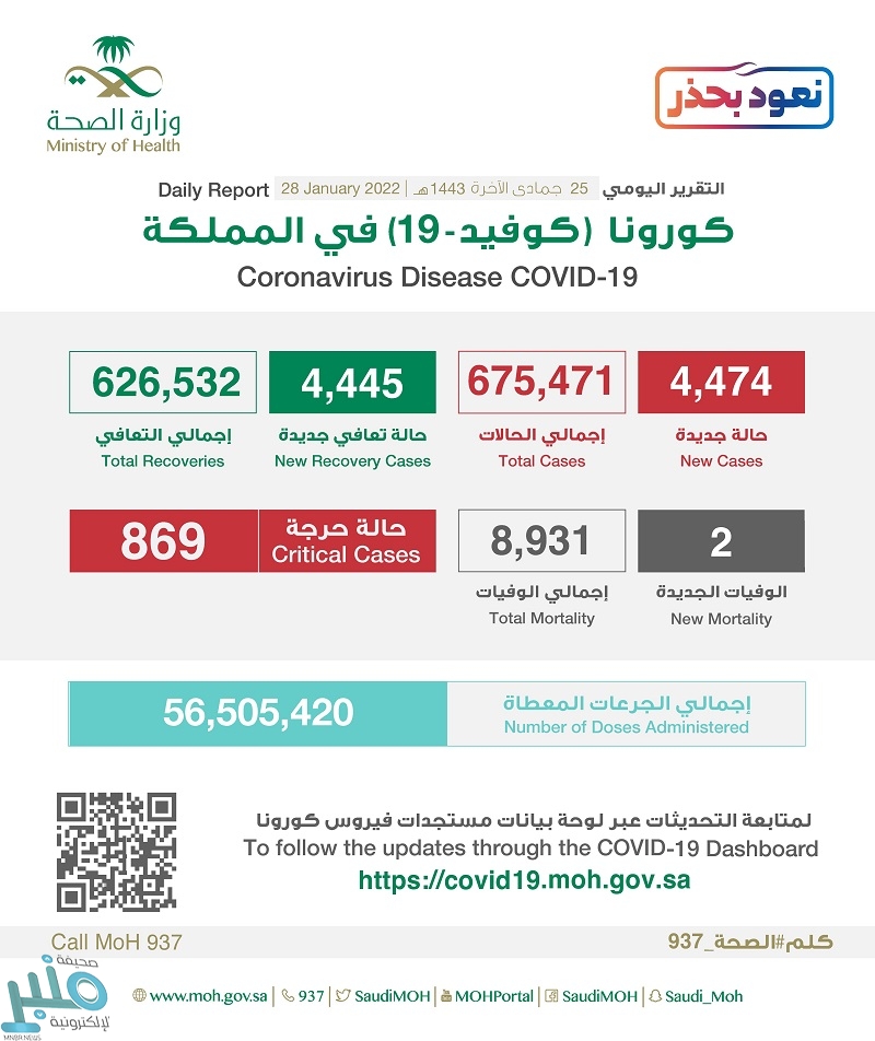 أعلنت وزارة الصحة، اليوم الجمعة (28 يناير 2022)، عن تسجيل 4474 إصابة جديدة بفيروس كورونا، و 4445 حالة تعافي و 2 حالات وفاة ، و 869 حالة حرجة.