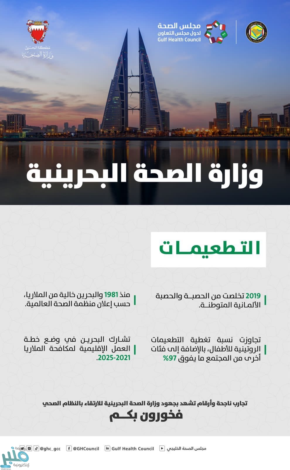 اشاد مجلس الصحة الخليجي عبر حساباته الرسمية في مواقع التواصل الاجتماعية عن طريق تصميم (انفوجرافيك) بجهود وتخطيط النظام الصحي البحريني المتميز في