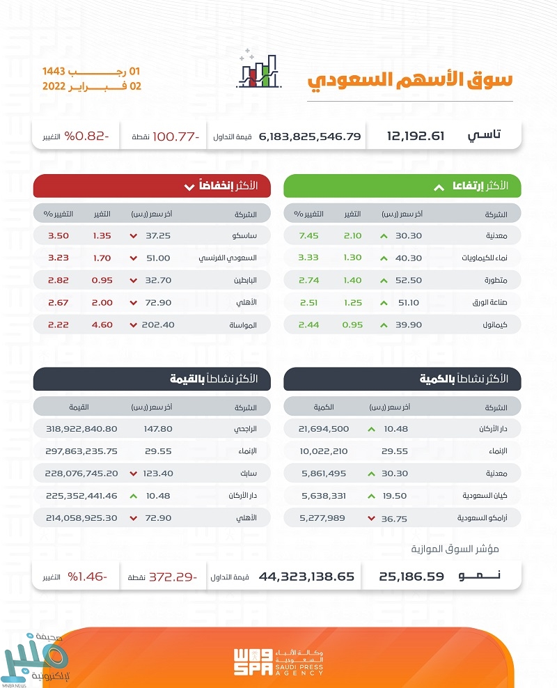 وكانت أسهم شركات معدنية، ونماء للكيماويات، ومتطورة، وصناعة الورق، وكيمانول الأكثر ارتفاعًا, أما أسهم شركات ساسكو، والسعودي الفرنسي، والبابطين، والأهلي، والمواساة الأكثر انخفاضًا في التعاملات, حيث تراوحت نسب الارتفاع والانخفاض ما بين 7.45% و 3.50% .