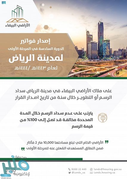 أعلن برنامج “الأراضي البيضاء” إصدار رسومه للدورة السادسة في المرحلة الأولى بمدينة الرياض لعام 1443 / 1444هــ، داعياً ملاك الأراضي المعنية إلى المبادرة بتطوير أراضيهم أو السداد خلال سنة من تاريخ إصدار القرار.