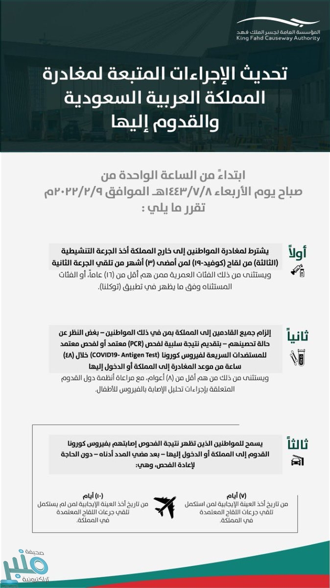 أعلنت المؤسسة العامة لجسر الملك فهد، اليوم (الخميس)، تحديث الإجراءات المتبعة لمغادرة المملكة والقدوم إليها، ابتداءً من الساعة الواحدة صباح يوم الأربعاء الموافق 9 / 2 / 2022 م.