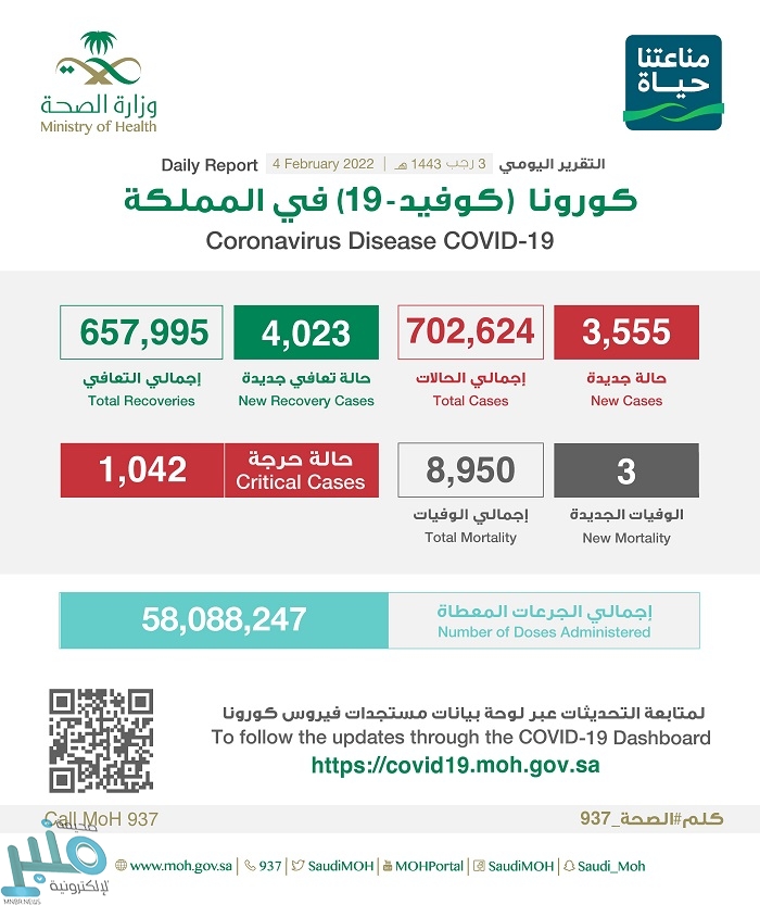 أعلنت وزارة الصحة، اليوم الجمعة (4 فبراير 2022)، عن تسجيل 3555 إصابة جديدة بفيروس كورونا، و 4023 حالة تعافي و 3 حالات وفاة ، و 1042 حالة حرجة.