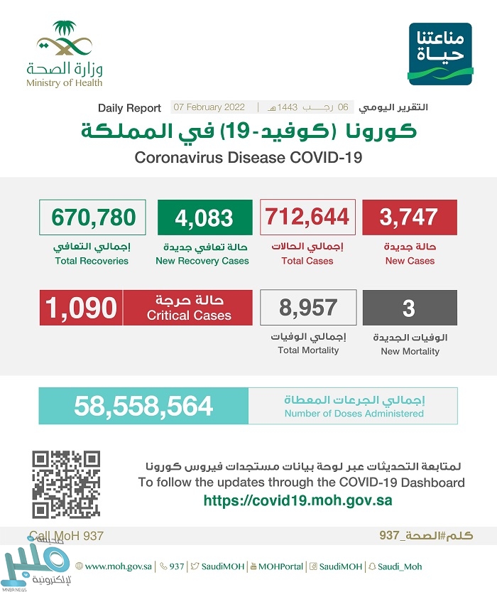 أعلنت وزارة الصحة، اليوم الإثنين (7 فبراير 2022)، عن تسجيل 3747 إصابة جديدة بفيروس كورونا، و 4083 حالة تعافي و 3 حالات وفاة ، و 1090 حالة حرجة.