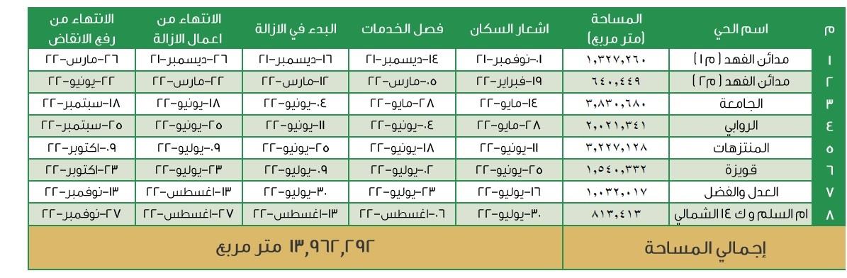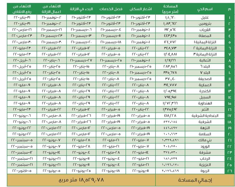 وتضمنت الخطة الزمنية والتنفيذية لإزالة الأحياء العشوائية في جدة، مواعيد البدء في عمليات الإزالة، بالإضافة إلى مواعيد الانتهاء من أعمال الإزالة، وموعد رفع الأنقاض، وإجمالي المساحة التي سيتم إزالتها.