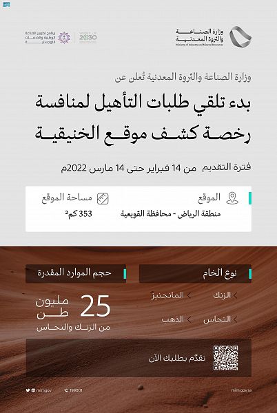 يُذكر أن معالي وزير الصناعة والثروة المعدنية الأستاذ بندر بن إبراهيم الخريِّف دشّن مبادرة “الاستكشاف المسرّع”، وأعلن طرح رخصة للتنقيب عن المعادن في موقع الخنيقية التابع لمحافظة القويعية بمنطقة الرياض مطلع العام الحالي، وذلك تماشيًا مع أهداف رؤية المملكة 2030 وبرنامج تطوير الصناعة الوطنية والخدمات اللوجستية “ندلب” باستغلال الفرص الكبيرة لإمكانات قطاع التعدين، ليكون الركيزة الثالثة للصناعة الوطنية.