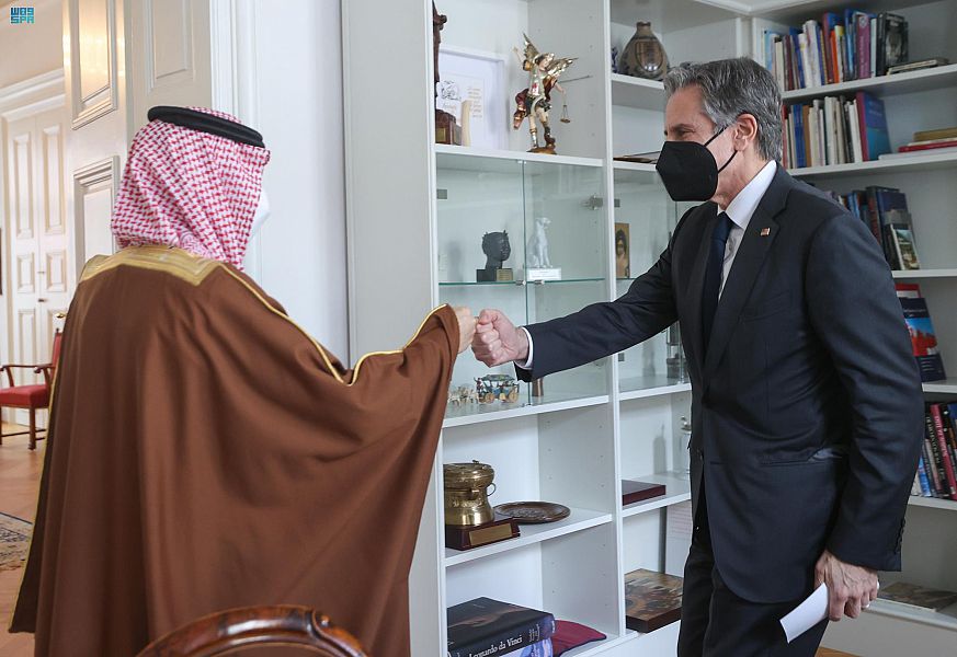 التقى صاحب السمو الأمير فيصل بن فرحان بن عبدالله وزير الخارجية، اليوم، بمعالي وزير خارجية الولايات المتحدة الأمريكية أنتوني بلينكن، وذلك على هامش أعمال مؤتمر ميونخ للأمن، في جمهورية ألمانيا الاتحادية.