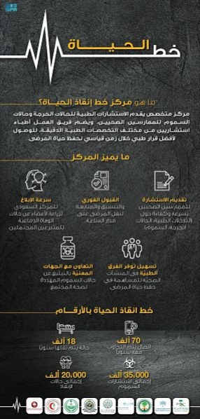 ويتلقَّى أخصائيو ” خط إنقاذ الحياة” المكالمات من خلال فرزها وتوجيهها للطبيب الاستشاري المناوب بحسب التخصص المطلوب، وذلك لضمان الوصول إلى أفضل قرار طبي في زمن قياسي، إضافة إلى متابعة سير عملية نقل المرضى المقبولين حتى الوصول إلى المنشأة المنقول إليها.