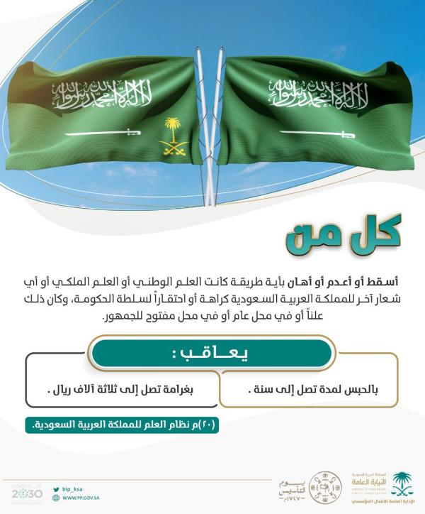 أكدت النيابة العامة أنه يعاقب بالحبس لمدة تصل إلى سنة وبغرامة تصل إلى ثلاثة آلاف ريال كل من أسقط أو أهان بأية طريقة كانت العلم الوطني أو العلم الملكي، أو أي شعار آخر للمملكة العربية السعودية كراهة أو احتقارا لسلطة الحكومة، وكان ذلك علنا أو في محل عام أو في محل مفتوح للجمهور.