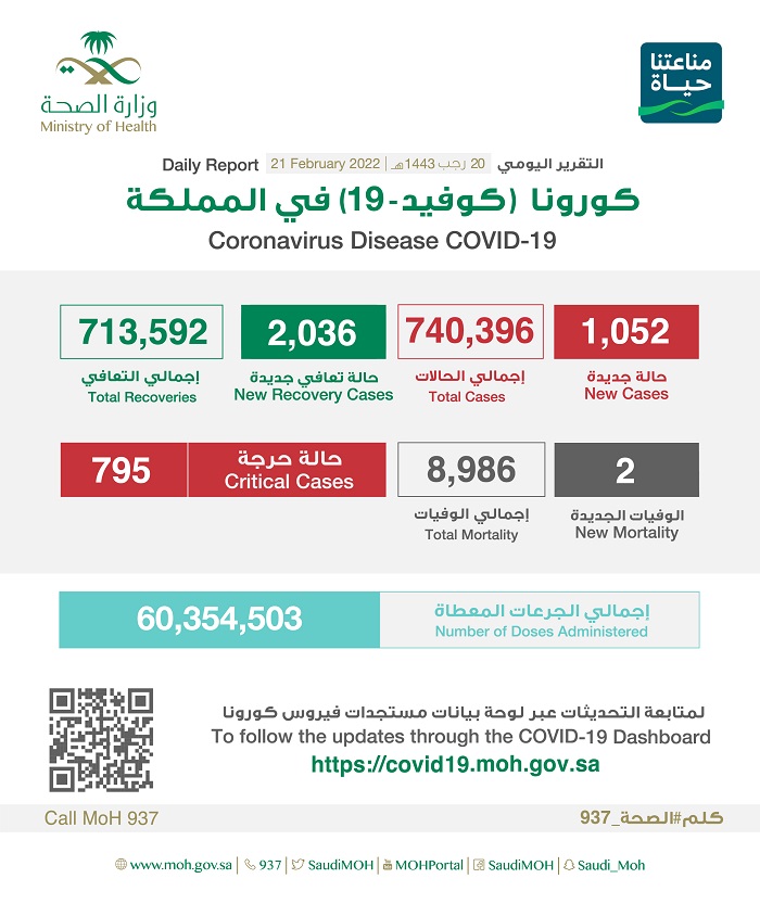 أعلنت وزارة الصحة، اليوم الإثنين (21 فبراير 2022)، عن تسجيل 1052 إصابة جديدة بفيروس كورونا، و 2036 حالة تعافي و حالتي وفاة ، و 795 حالة حرجة.