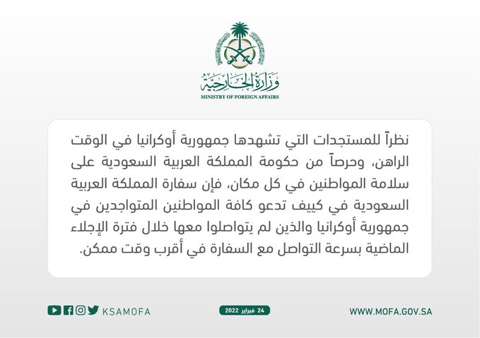 وقالت السفارة إن ذلك يأتي نظرا للمستجدات التي تشهدها جمهورية أوكرانيا في الوقت الراهن، وحرصا من حكومة السعودية على سلامة المواطنين في كل مكان.