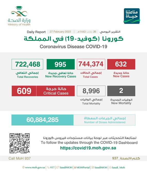 أعلنت وزارة الصحة، اليوم الأحد (27 فبراير 2022)، عن تسجيل 632 إصابة جديدة بفيروس كورونا، و 995 حالة تعافي و حالتي وفاة ، و 609 حالة حرجة.