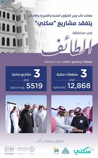 تفقّد معالي نائب وزير الشؤون البلدية والقروية والإسكان المهندس عبدالله بن محمد البدير اليوم مشاريع برنامج “سكني” بمحافظة الطائف، البالغ عددها 3 مشاريع توفّر أكثر من 5519 وحدة سكنية متنوعة ما بين فلل وتاون هاوس وشقق، إضافة إلى 3 مخططات سكنية توفر نحو 12868 قطعة أرض، واطّلع معاليه على سير العمل ومستوى الإنجاز.