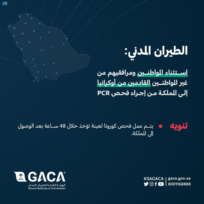 ونصَّ التعميم على أنه يجب على شركات الطيران استثناء المواطنين ومرافقيهم من غير المواطنين القادمين من أوكرانيا إلى المملكة من إجراء فحص (PCR) على أن يتم عمل فحص كورونا لعينة تؤخذ خلال (48) ساعة بعد وصولهم إلى المملكة.