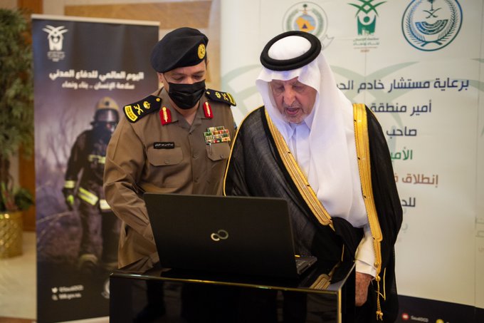 دشن مستشار خادم الحرمين الشريفين أمير منطقة مكة المكرمة صاحب السمو الملكي الأمير خالد الفيصل اليوم بمقر الغمارة بجدة، فعاليات اليوم العالمي للدفاع المدني بالمنطقة تحت شعار (سلامة الإنسان بناء ونماء)، بحضور مدير الدفاع المدني بالمنطقة اللواء عبدالله القرشي.
