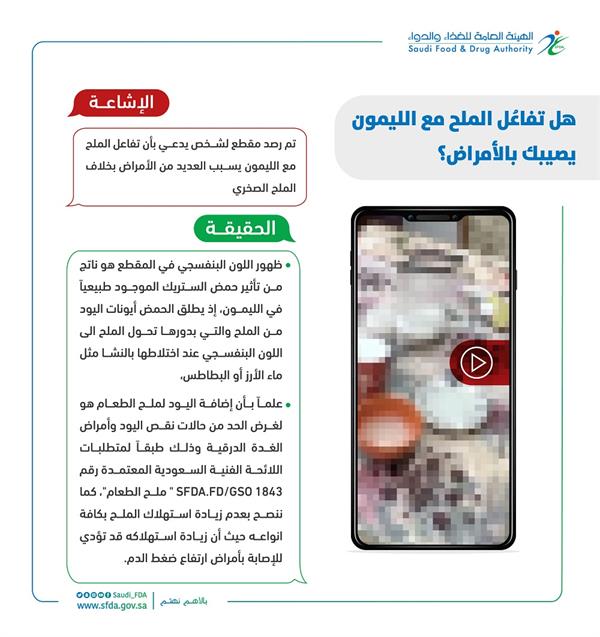 وأكدت الهيئة عدم صحة الادعاءات التي ذكرت في المقطع المتداول، مشيرة إلى أن ظهور اللون البنفسجي في المقطع هو ناتج من تأثير حمض الستريك الموجود طبيعيا في الليمون، إذ يطلق الحمض أيونات اليود من الملح والتي بدورها تحول الملح إلى اللون البنفسجي عند اختلاطها بالنشا مثل ماء الأرز أو البطاطس .