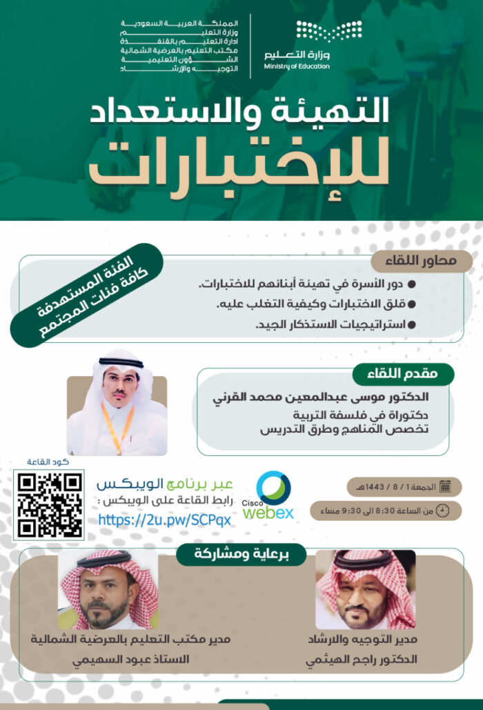 يقيم قسم التوجيه والإرشاد بمكتب تعليم العرضية الشمالية غدًا الجمعةالموافق ١/ ٨ /١٤٤٣ الساعة ٨:٣٠ مساءً ضمن خطته لاختبارات نهاية الفصل الدراسي الثاني ١٤٤٣ لقاءً بخصوص التهيئة والاستعداد للاختبارات، بإشراف ومتابعة مدير مكتب التعليم بالعرضية الشمالية الأستاذ عبود السهيمي، وبمشاركة رئيس القسم الدكتور راجح محمد الهيثمي، ويدير اللقاء الدكتور موسى القرني.