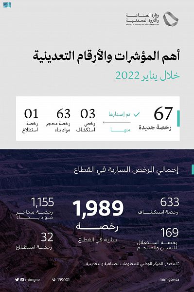 كشفت وزارة الصناعة والثروة المعدنية عن إصدار 67 رخصة تعدينية خلال شهر يناير الماضي 2022، ليصل إجمالي عدد الرخص التعدينية السارية في القطاع إلى 1,989 رخصة، تتصدرها رخص مواد البناء بـ 1,155رخصة، ثم رخص الكشف بـ 633 رخصة.
