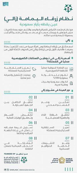أعلنت الهيئة العامة للصناعات العسكرية على هامش معرض الدفاع العالمي عن توطين نظام مراقبة جديد متعدد الاستخدامات باسم “زرقاء اليمامة- زالي” من تصنيع الشركة الوطنية للأنظمة الميكانيكية.