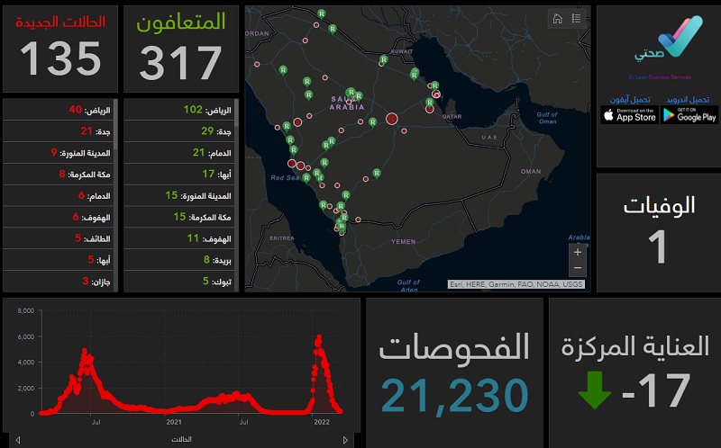 أعلنت وزارة الصحة اليوم (السبت) تسجيل 135 إصابة جديدة بفايروس كورونا المستجد المسبب لمرض «كوفيد-19»، فيما رصدت تعافي 317 حالة، ووفاة حالة واحدة.