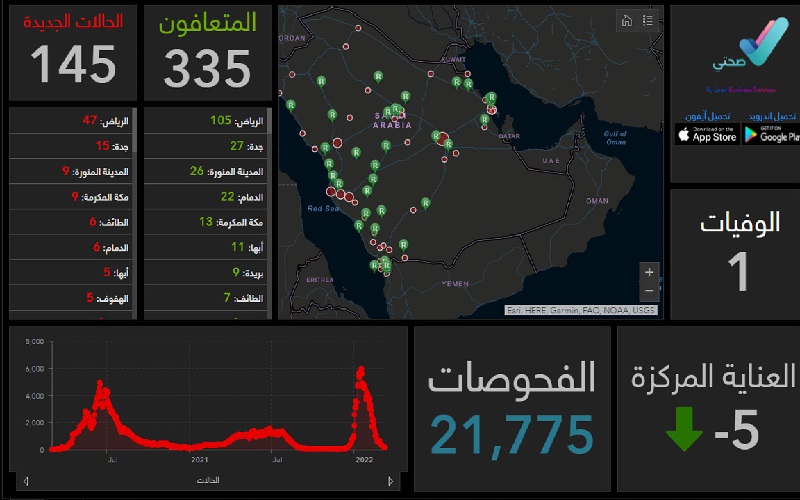 وسجلت الصحة خلال الـ24 ساعة الماضية : 145 إصابة جديدة بفيروس كورونا، و 335 حالة تعافي و 1 حالة وفاة ، و 308 حالة حرجة. فيما بلغ إجمالي حالات المصابين في المملكة 748,769 حالة حتى الآن، ووصل مجموع المتعافين إلى 730,690 حالة، فيما بلغ إجمالي الوفيات 9017 حالة وفاة.