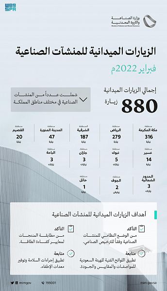 واصلت وزارة الصناعة والثروة المعدنية ممثلةً في إدارة المتابعة والرقابة الصناعية جهود المتابعة والإشراف على المصانع في المملكة، منفّذة 880 زيارة ميدانية على المنشآت الصناعية خلال شهر فبراير الماضي؛ للتأكد من التزامها بمعايير الجودة والاشتراطات اللازمة.