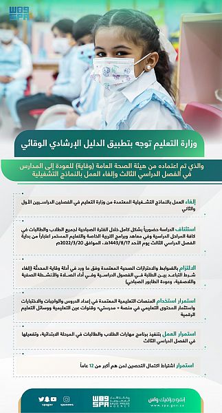 كما وجهت الوزارة إدارات التعليم في المناطق والمحافظات بالبدء في تطبيق التحديثات على الدليلين، بما يتضمنانه من الترتيبات المتعلقة بعودة التعليم حضورياً وبشكلٍ كامل للطلبة في المرحلة الابتدائية ورياض الأطفال، مع الالتزام بالإجراءات الاحترازية المعتمدة من وزارة الصحة ووقاية، وإلغاء شرط التباعد بين الطلبة في الفصول الدراسية وفي أداء الصلاة والأنشطة الصفية واللاصفية، وعودة الطابور الصباحي.