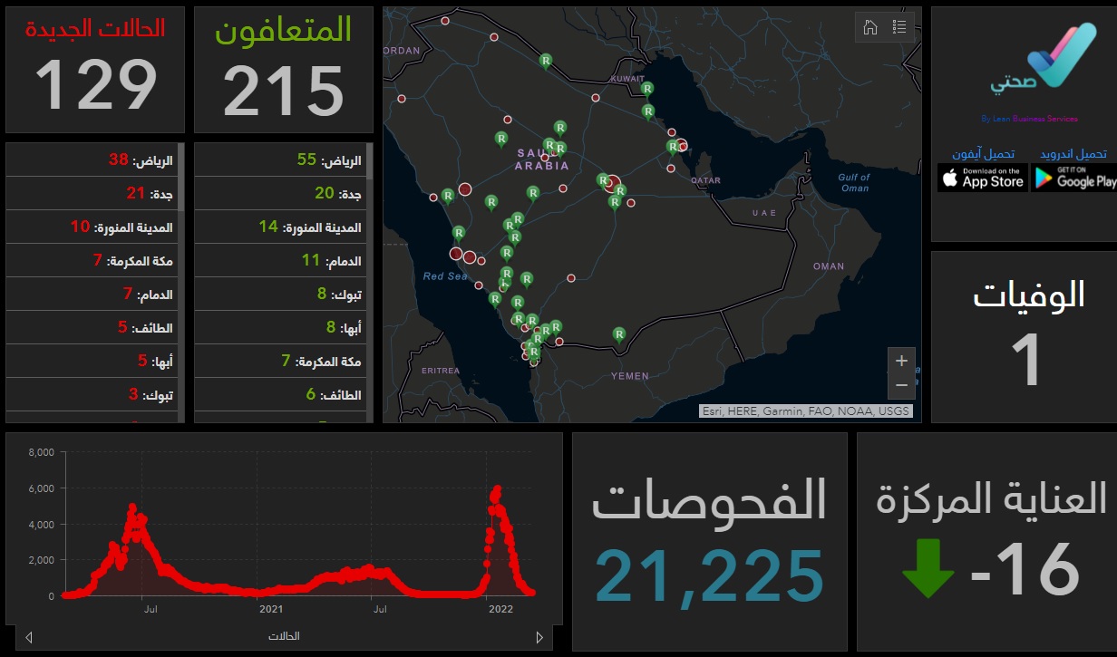 وسجلت الصحة خلال الـ24 ساعة الماضية : 129 إصابة جديدة بفيروس كورونا، و 215 حالة تعافي و1 حالة وفاة ، و 256 حالة حرجة. فيما بلغ إجمالي حالات المصابين في المملكة 749,044 حالة حتى الآن، ووصل مجموع المتعافين إلى 731,219 حالة، فيما بلغ إجمالي الوفيات 9020 حالة وفاة.