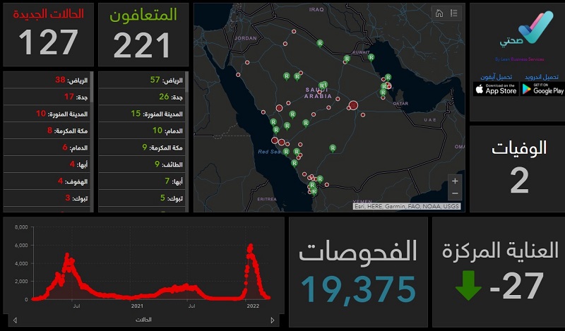 وسجلت الصحة خلال الـ24 ساعة الماضية : 127 إصابة جديدة بفيروس كورونا، و 221 حالة تعافي و2 حالة وفاة ، و 229 حالة حرجة. فيما بلغ إجمالي حالات المصابين في المملكة 749,171 حالة حتى الآن، ووصل مجموع المتعافين إلى 731,440 حالة، فيما بلغ إجمالي الوفيات 9022 حالة وفاة.