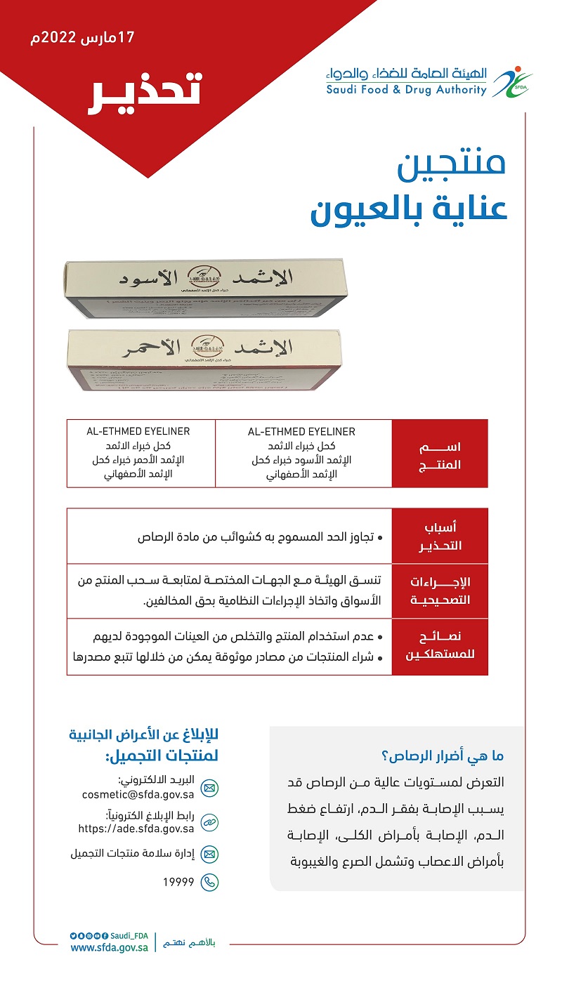 حذّرت الهيئة العامة للغذاء والدواء من منتجي عناية بالعيون هما كحل خبراء الإثمد، والإثمد الأسود والأحمر، وذلك لاحتوائهما على نسبة عالية من الرصاص، تجاوزت الحد المسموح به كشوائب.