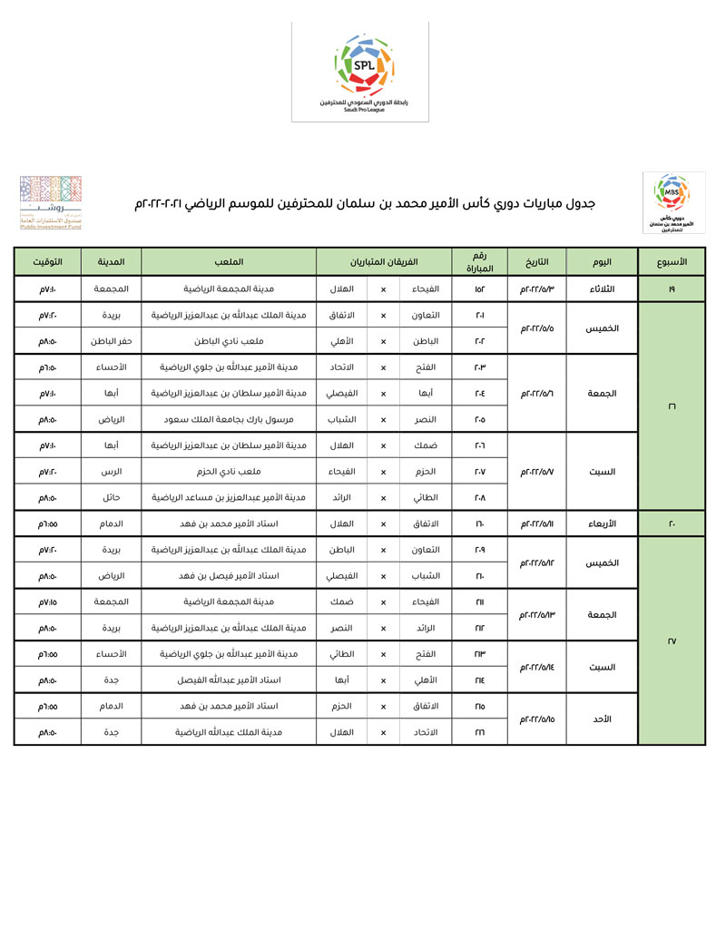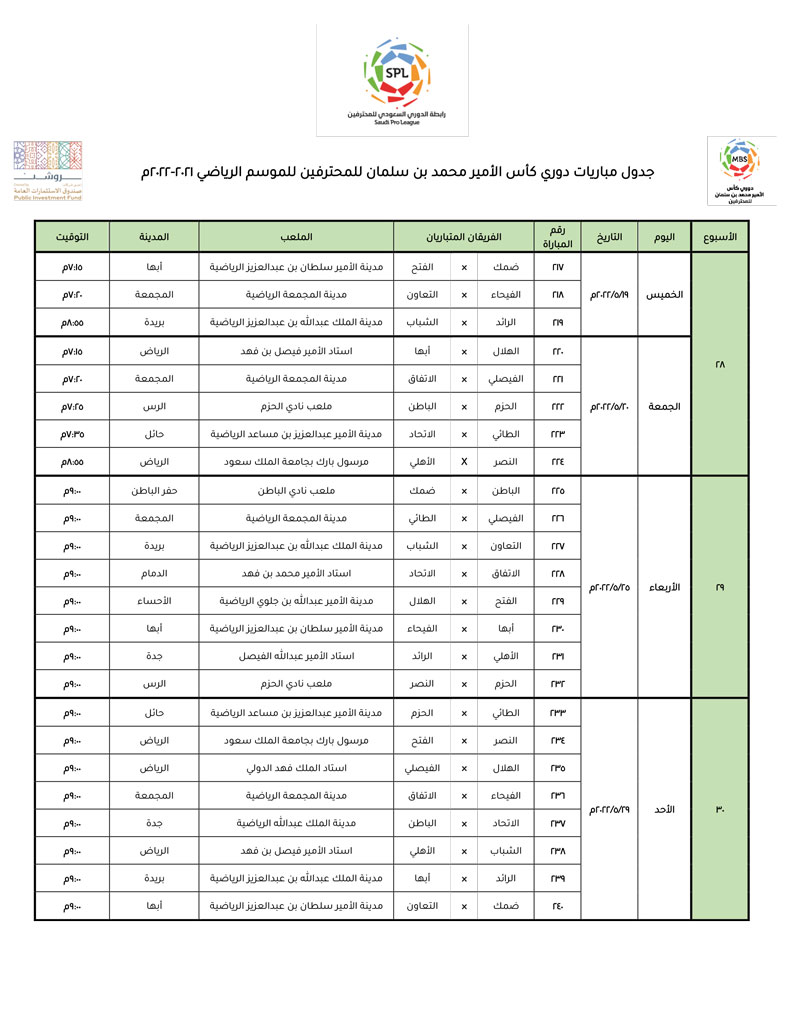 أعلنت لجنة المسابقات في الرابطة مواعيد مباريات الجولات من (26) إلى (30) من مسابقة دوري كأس الأمير محمد بن سلمان للمحترفين. حيث تنطلق الجولة (26) يوم الخميس 5 مايو القادم، وتختتم مسابقة دوري كأس الأمير محمد بن سلمان للمحترفين بلقاءات الجولة (30) والتي ستكون في توقيت واحد يوم الأحد 29 مايو 2022م.