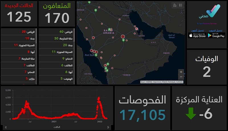 وسجلت الصحة خلال الـ24 ساعة الماضية : 125 إصابة جديدة بفيروس كورونا، و 170 حالة تعافي و 2 حالة وفاة ، و 178 حالة حرجة. فيما بلغ إجمالي حالات المصابين في المملكة 749,855 حالة حتى الآن، ووصل مجموع المتعافين إلى 732,454 حالة، فيما بلغ إجمالي الوفيات 9031 حالة وفاة.