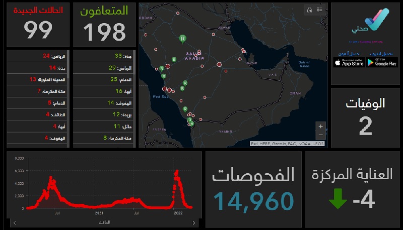 وسجلت الصحة خلال الـ24 ساعة الماضية : 99 إصابة جديدة بفيروس كورونا، و 198 حالة تعافي و 2 حالة وفاة ، و 142 حالة حرجة. فيما بلغ إجمالي حالات المصابين في المملكة 750,179 حالة حتى الآن، ووصل مجموع المتعافين إلى 732,939 حالة، فيما بلغ إجمالي الوفيات 9035 حالة وفاة.