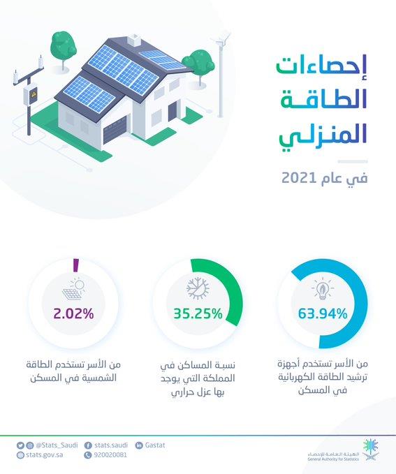 أعلنت الهيئة العامة للإحصاء زيادة استخدام مصادر الطاقة النظيفة والمتجددة في مساكن المملكة لعام 2021.