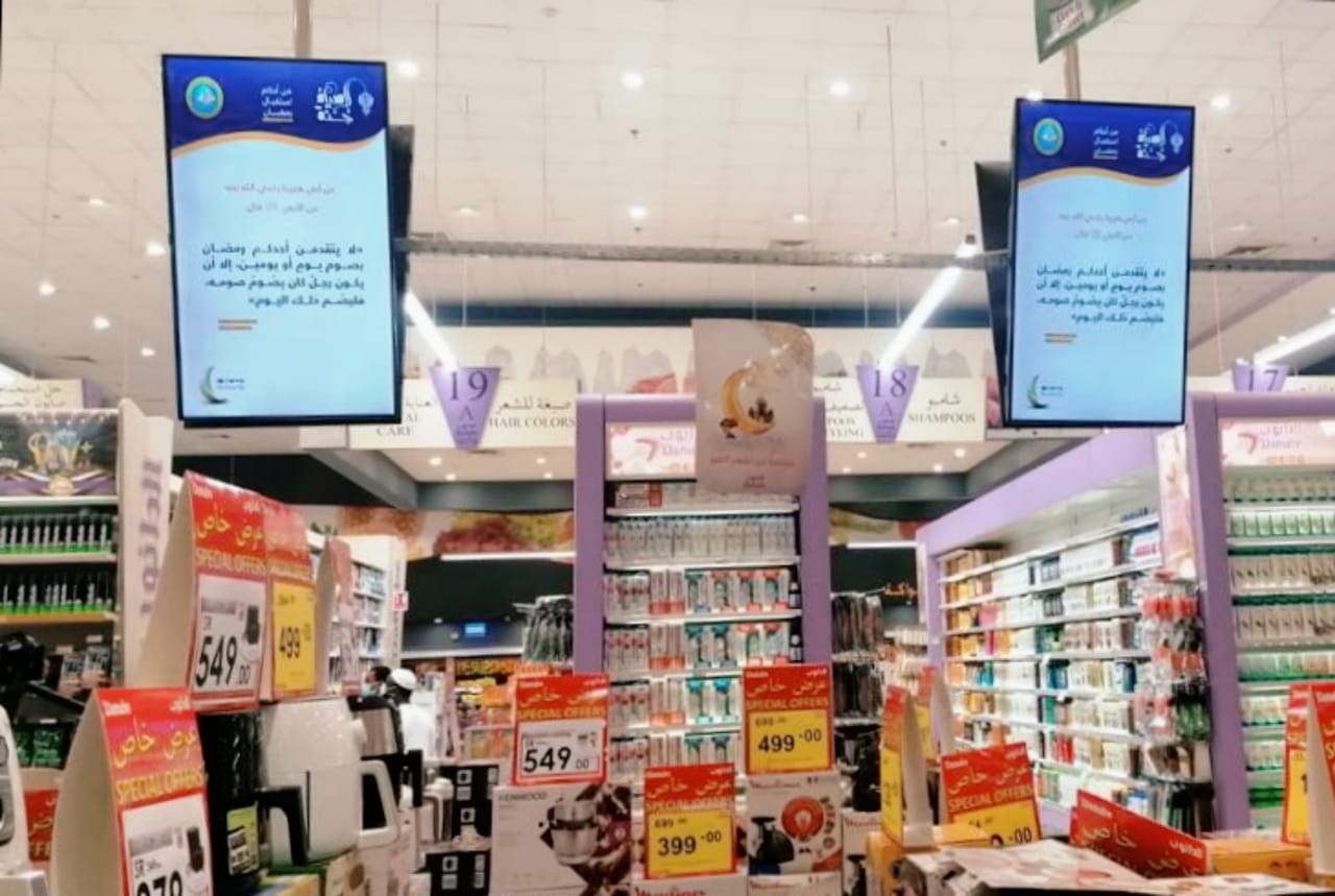 عرضت هيئة الأمر بالمعروف والنهي عن المنكر بمحافظة جدة المحتوى التوعوي لبرنامج ”الصيام جُنة” في المراكز التجارية (أسواق بنده – أسواق بن داود- أسواق مناويل – أسواق الدانوب) وذلك من خلال عرض إصدارات الرئاسة العامة من بطاقات توعوية عبر الشاشات الرقمية واللوحات الإلكترونية.