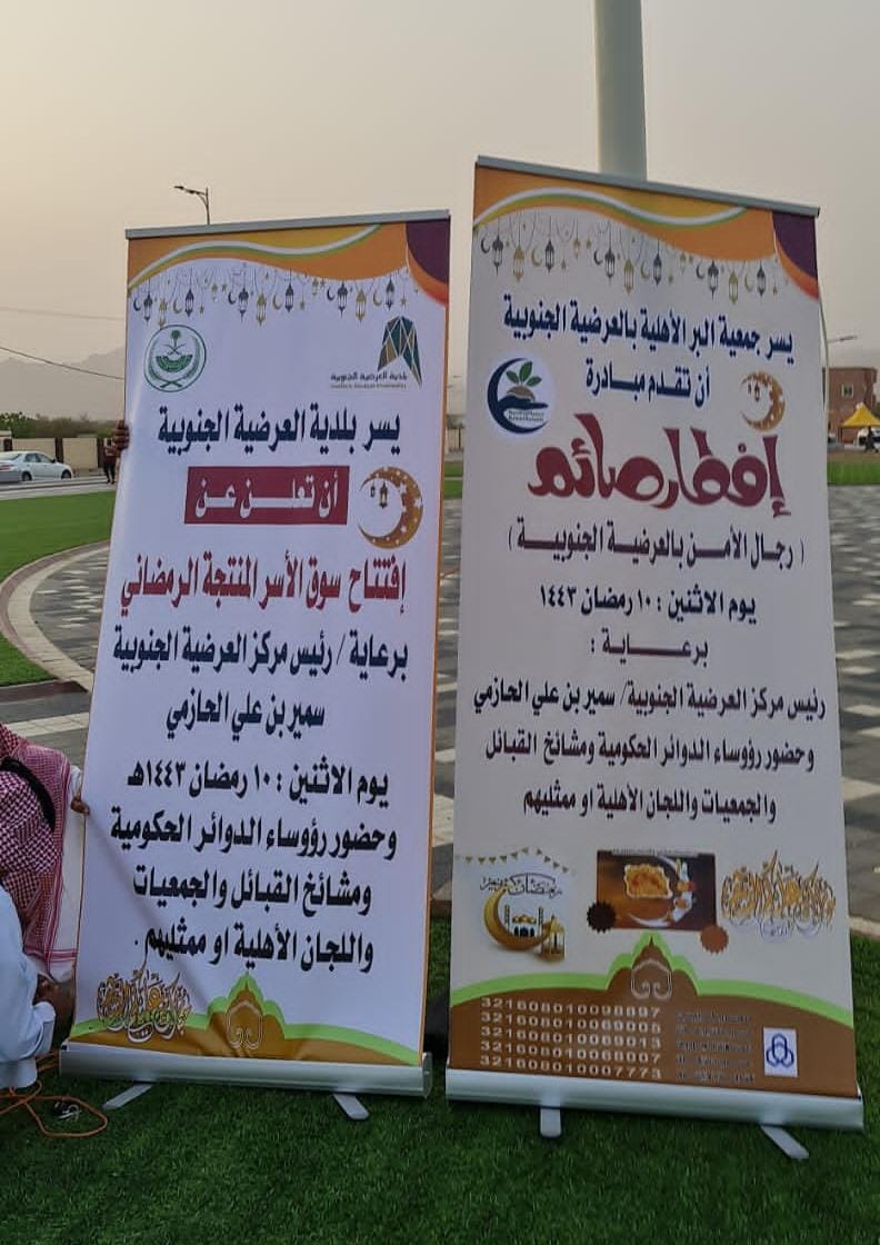 أقامت جمعية البر الخيرية في العرضية الجنوبية إفطار صائم لرجال الأمن، بحضور رئيس مركز العرضية الجنوبية سمير بن علي الحازمي، وعدد من رؤساء الدوائر الحكومية ومشايخ القبائل، وذلك في حديقة البلدية في مدخل ثريبان.