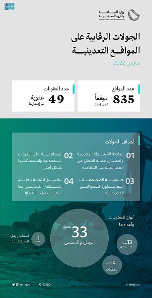 نفذت وزارة الصناعة والثروة المعدنية ممثلة بوكالة الرقابة التعدينية 835 جولة رقابية على عدد من المواقع التعدينية في مختلف مناطق المملكة خلال شهر مارس الماضي، وأصدرت 49 عقوبة على المنشآت المخالفة لنظام الاستثمار التعديني، تتمثل في (33) عقوبة لاستغلال الرمل والحصى و(13) عقوبة لاستغلال خام البحص، وعقوبتين لاستغلال مواد الردميات وعقوبة واحدة لاستغلال رمل السيليكا.